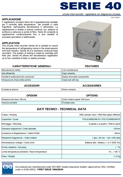 The circular chart recorder Series 40 is suitable to record the temperature of refrigerating rooms in the pharmaceutic and food industry.